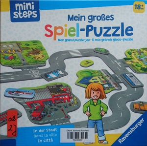 Feuerwehr, Bahnhof, Krankenhaus - Wie bei einem Spielteppich zeigt das Bodenpuzzle eine kleine Stadt aus der Vogelperspektive. Straßen und Gebäude lassen sich dabei kreativ immer wieder neu anordnen und mit passenden Fahrzeugen und Figuren beleben.
